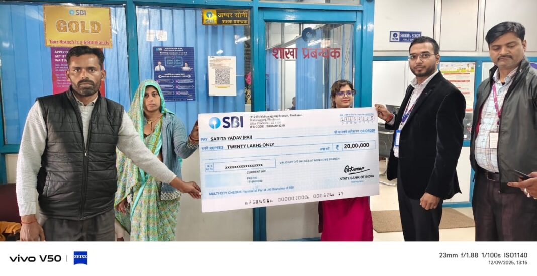 महराजगंज (रायबरेली)। कोतवाली क्षेत्र के पूरे जमादार, बावन बुजुर्ग बल्ला निवासी उदय भान यादव की 14 जून को हरियाणा के पलवल में सड़क दुर्घटना में मौत हो गई थी। परिवार पर दुखों का पहाड़ टूट पड़ा था। मगर ऐसे विपरीत समय में उनकी ली गई एसबीआई जनरल बीमा पॉलिसी परिवार के लिए संबल बनकर सामने आई। उदय भान यादव द्बारा स्टेट बैंक महराजगंज शाखा से कराई गई यह पॉलिसी मात्र 1००० रुपए वार्षिक प्रीमियम की थी, जिसके तहत दुर्घटनाजनित मृत्यु पर 2० लाख रुपए की बीमा राशि निर्धारित थी। मंगलवार को स्टेट बैंक महराजगंज शाखा में शाखा प्रबंधक अम्बर सोनी ने उदय भान यादव की पत्नी सरिता यादव को 2० लाख रुपए का चेक सौंपा। चेक मिलने के दौरान सरिता यादव के परिजन भी मौजूद रहे। शाखा प्रबंधक अम्बर सोनी ने कहा कठिन समय में बीमा सहायता परिवार के लिए महत्वपूर्ण सहारा साबित होती है। हम चाहते हैं कि हर परिवार ऐसी योजनाओं से जुड़कर सुरक्षित भविष्य सुनिश्चित करे। बैंक की प्राथमिकता है कि लाभार्थी को बिना किसी परेशानी के उनका हक मिले। वहीं भावुक सरिता यादव ने कहा कि पति के जाने के बाद घर की जिम्मेदारियाँ बढ़ गई थीं। बैंक की इस मदद से बच्चों और परिवार का भविष्य संभालने में बड़ी राहत मिलेगी। हम स्टेट बैंक के आभारी हैं कि समय पर सहायता मिली। बीमा राशि मिलने से शोकाकुल परिवार को आर्थिक बल मिला है और स्थानीय लोगों में बीमा योजनाओं के प्रति जागरुकता भी बढ़ी है।