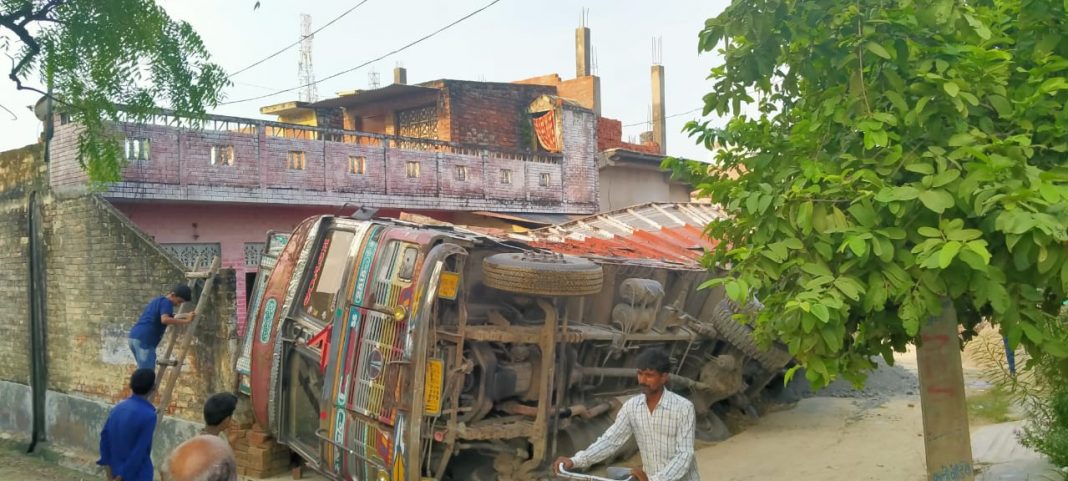 जगतपुर,रायबरेली । ब्लॉक क्षेत्र के मनोहरगंज ग्राम सभा के पूरे कोठी में राख भरा ट्रक संख्या यूपी 33 टी 2797 शुक्रवार की रात दस बजे एक मकान के ऊपर पलट गया। ट्रक में राख लदी थी। जलकल की सड़क किनारे लाइन बिछने के कारण चक्का जमीन में धंसने से पलटा ट्रक। गौरतलब है कि घटना के समय परिवार के सभी लोग टीवी कार्यक्रम देख रहे थे। इस कारण कोई जान-माल की क्षति नहीं हुई है। ट्रक की बॉडी पूरी तरह चकनाचूर हो गई है। बाउंड्री वाल सहित उसमें खड़ी पैशन प्रो मोटरसाइकिल चकनाचूर हो गई। मकान के आगे का भाग भी काफी क्षतिग्रस्त हो गया। ग्रह स्वामी पूर्व पुलिसकर्मी भारत सिंह चौहान ने बताया है कि लगभग एक लाख का नुकसान हुआ है।ट्रक पलटते ही चालक मौके से फरार हो गया। पुलिस को तहरीर दी गई है। आपको बताते चले की कुछ वर्ष पहले ही भारत सिंह के बड़े पुत्र की बिजली की चपेट में आने से मौत हो गई थी। परिवार मालीय दिक्कतों से गुजर रहा था।