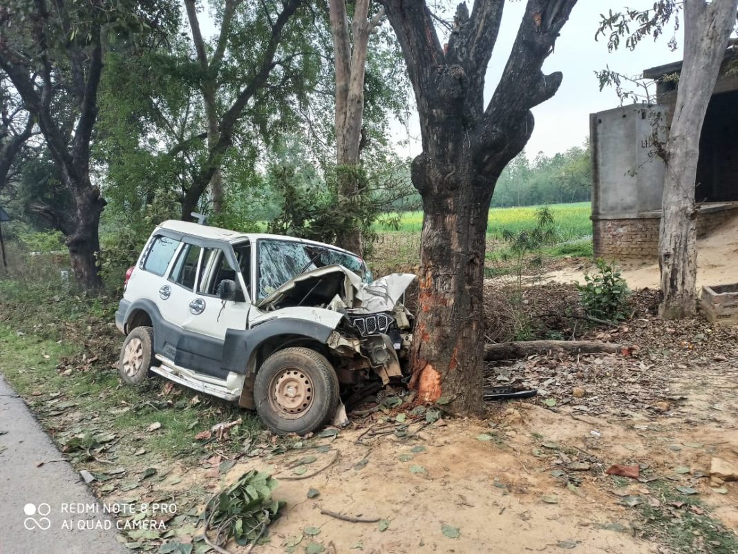 जगतपुर कोतवाली क्षेत्र के लखनऊ- प्रयागराज राजमार्ग के चांदमऊ मोड़ के निकट महुआ के पेड़ से टकराकर वाहन दुर्घटनाग्रस्त हो गया। यह दिल दहलाने वाली घटना दोपहर में घटी जब तेज रफ्तार स्कॉर्पियो UP 71 AE 5817 महुआ के पेड़ से टकरा गई। टक्कर इतनी जोरदार थी कि पेड जड से हिल गया ।वही मौके पर मौजूद लोगों ने बताया कि स्कॉर्पियो अनियंत्रित होकर पेड़ से टकरा गई । यह रायबरेली की ओर से आ रही थी ।वाहन में अबीर और रंग फैला हुआ था ।स्कॉर्पियो के मीटर 120 की स्पीड पर फंस कर रुक गया था।इससे इस बात का अंदाजा लगाया जा सकता है कि इस वाहन की रफ्तार लगभग 150 से 175 किलोमीटर प्रति घंटा रही होगी। देखते ही देखते लोगों की भीड़ इकट्ठा हो गई। प्रत्यक्षदर्शियों ने बताया है कि दो ने मौके पर ही दम तोड़ दिया तथा तीसरे को नाजुक हालत में अस्पताल ले जाया गया। जहां उसकी मौत हो गई। मौके पर पहुंची जगतपुर कोतवाली टीम की सराहना की जाएगी कि तुरंत बचाव और राहत कार्य जारी कर दिया , वहीं स्थानीय लोगों की सूचना पर जल्द ही राहत कार्य हो सका।
