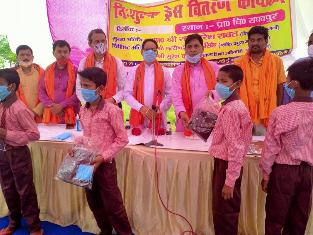 बताते चलें कि विकास खण्ड के राघवपुर प्राथमिक विद्यालय में कोरोना संक्रमण काल मे ड्रेस वितरण कार्यक्रम का आयोजन किया गया जहां पर प्राथमिक विद्यालय राईमऊ, पखनपुर, ओई प्रथम व जूनियर विद्यालय पखनपुर के छात्र छात्राओं को मूल विद्यालय से दो किलोमीटर दूर बुलाकर ड्रेस वितरण कराया गया। शासन के निर्देशानुसार 67/33 मुफतलाल मार्का कपड़ें से बनी ड्रेस का वितरण ही कराया जाना चाहिए परन्तु कमीशनबाजी के चक्कर में मानक विहीन एवं रद्दी ड्रेसो का वितरण किया गया। खास बात यह रही कि मौके पर खण्ड शिक्षा अधिकारी महराजगंज सुरेश कुमार एवं खण्ड शिक्षा अधिकारी बछरावां पद्म शेखर मौर्य की उपस्थिति होने के बावजूद यह गोरखधन्धा छिपाने के लिए माननीय की आड़ लेते हुए उन्ही के हाथों ड्रेस का वितरण करा दिया गया। मामले में खण्ड शिक्षा अधिकारी सुरेश कुमार से पूछा गया तो सवाल को टालते हुए कार्यक्रम स्थल से रवाना हो गये।