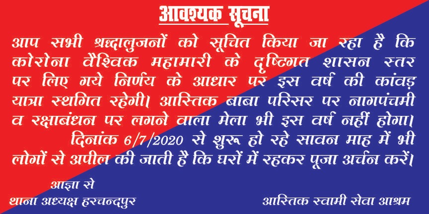 कोरोना संक्रमण को देखते हुए जिला प्रशासन व मंदिर प्रशासन ने यह निर्णय लिया है कि प्रत्येक वर्षो की भांति नाग पंचमी को लगने वाला स्वामी आस्तीक मंदिर का मेला इस बार नही लगेगा।