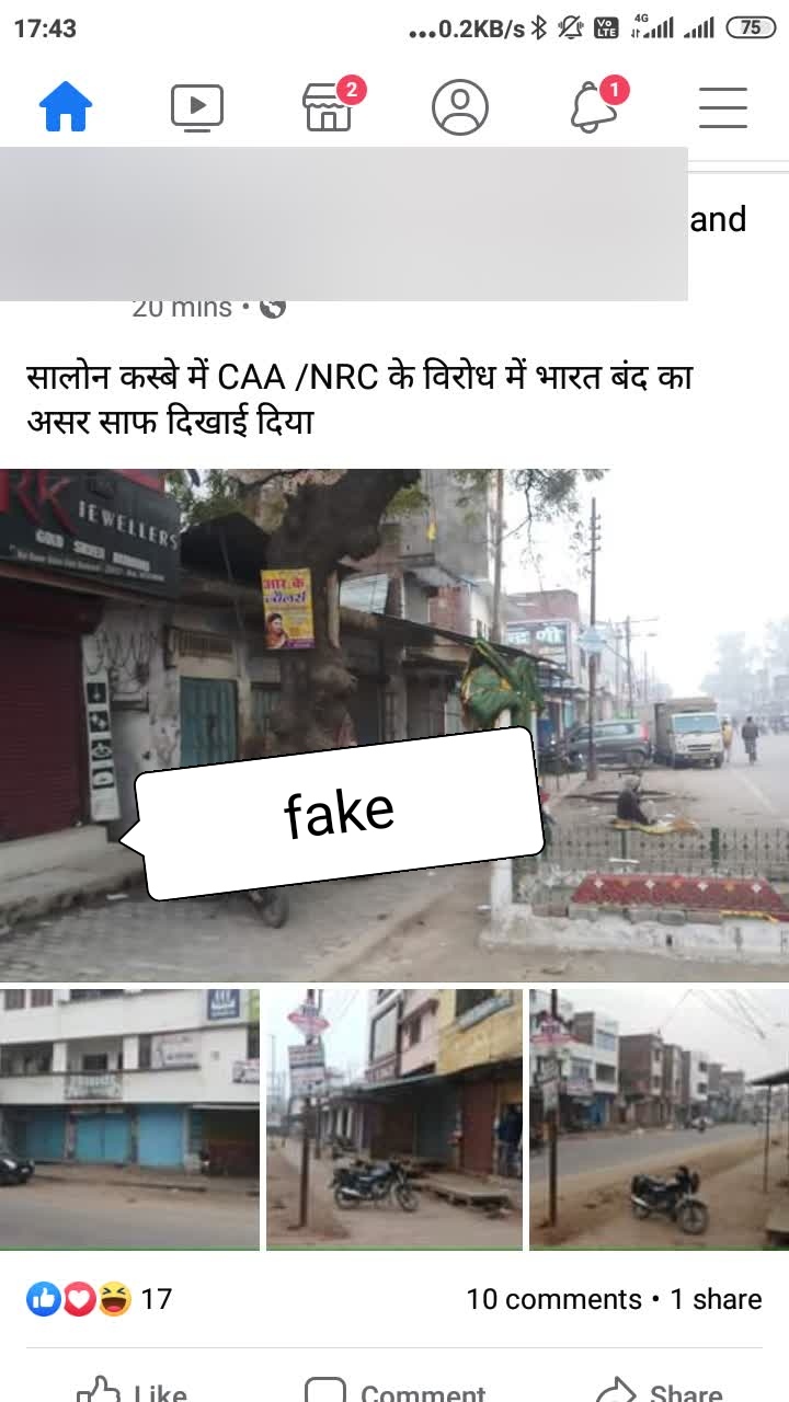 सलोन रायबरेली-साप्ताहिक बन्दी को भारत बन्दी का नाम देकर सोशल मीडिया पर अफवाह फैलाने वाले एक पोस्ट पर हड़कम्प मच गया।मामले की सूचना क्षेत्राधिकारी विनीत सिंह को हुई।जिसके बाद युवक को क्षेत्राधिकारी ने अपने ऑफिस बुलाकर पहले फटकार लगाई।जिसके बाद युवक ने माफीनामा लिखकर सोशल साइट्स फेसबुक से अपना विवादित पोस्ट डिलीट कर दिया।नागरिकता संसोधन बिल को लेकर हाल ही में रायबरेली में महिलाओं ने विरोध प्रदर्शन कर अपने गुस्से का इजहार किया था।लेकिन सलोन क्षेत्र में प्रशासन की सख्ती से अमन चैन कायम था।जानकारी के मुताबिक सलोन कोतवाली क्षेत्र के एक युवक द्वारा “सलोन कस्बे में सीएए/एनआरसी के विरोध में भारत बन्द का असर साफ दिखाई दिया”सोशल साइट्स पर पोस्ट के साथ चार अलग अलग बन्द दुकानों की फ़ोटो डाल कर पोस्ट को फेसबुक पर वायरल कर दिया था।इस दौरान कस्बे के कई सभ्रांत नागरिको ने पोस्ट को फर्जी और गलत बताते हुए इसका विरोध भी किया।जानकारी के लिए बतादे कि जिस प्रतिष्ठानों को सीएए/एनआरसी के विरोध में बन्दी दिखाई गई।दरअसल सलोन में बुधवार को साप्ताहिक बन्दी के दिन की वो सभी फ़ोटो थी।और हर बुधवार को साप्ताहिक बन्दी के दिन सलोन नगर के लोग अपनी दुकानें बंद रखते है।और युवक द्वारा साप्ताहिक बन्दी का फोटो एनआरसी के विरोध में भारत बन्दी का बताकर पोस्ट वायरल किया गया था।वही क्षेत्राधिकारी विनीत सिंह ने मामले को गम्भीरता से लेते हुए युवक को अपने ऑफिस बुलाया।जहाँ उसने माफीनामा पत्र लिखकर सोशल साइट्स से विवादित पोस्ट को हटा दिया है।इस सम्बंध में क्षेत्राधिकारी विनीत सिंह ने कहा कि युवक की सोशल मीडिया के फेसबुक से विवादित पोस्ट डिलीट करा दिया गया है।उसने माफीनामा पत्र दिया है।क्षेत्र में अमन चैन खराब करने का अधिकार किसी को नही है।अगर किसी के द्वारा किसी भी तरीके से विवादित पोस्ट की जाती है तो आगे सख्त से सख्त कार्यवाही की जायेगी।